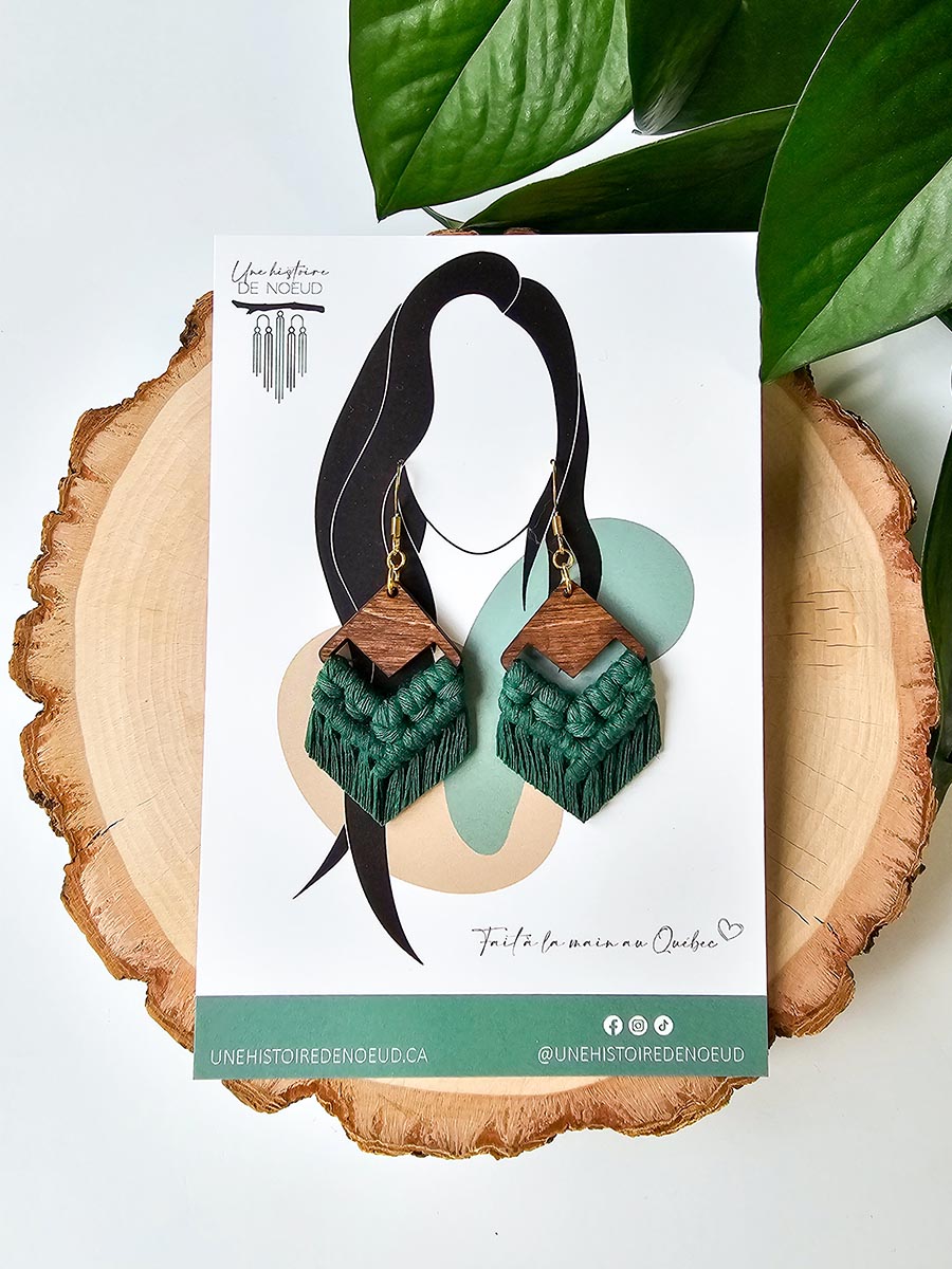 À propos | Boucles d’oreilles sur base en bois petite, couleur vert forêt et crochet or
