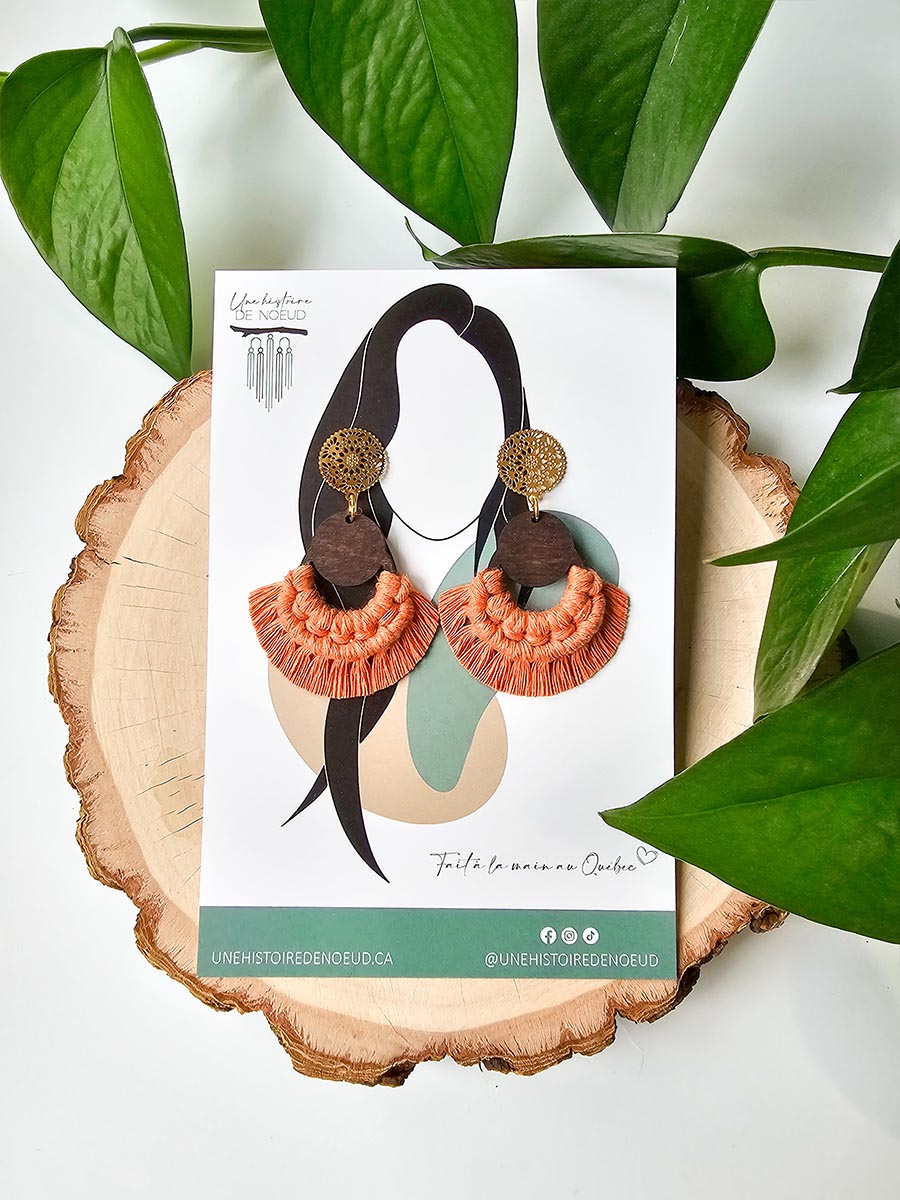 À propos | Boucles d'oreilles en macramé, base en bois, couleur orange brûlé, attaches or