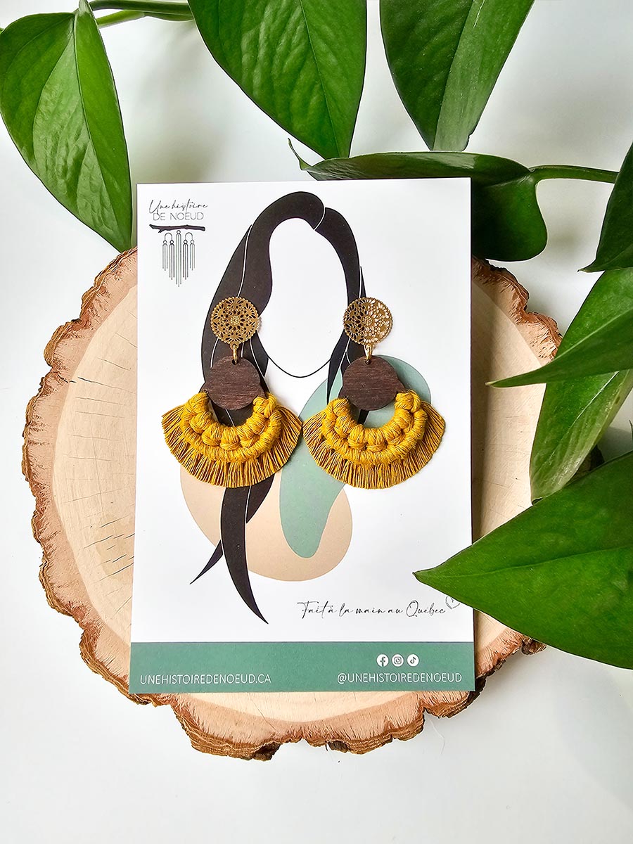 Boucles d'oreilles en macramé, base en bois, couleur jaune épicé, attaches or