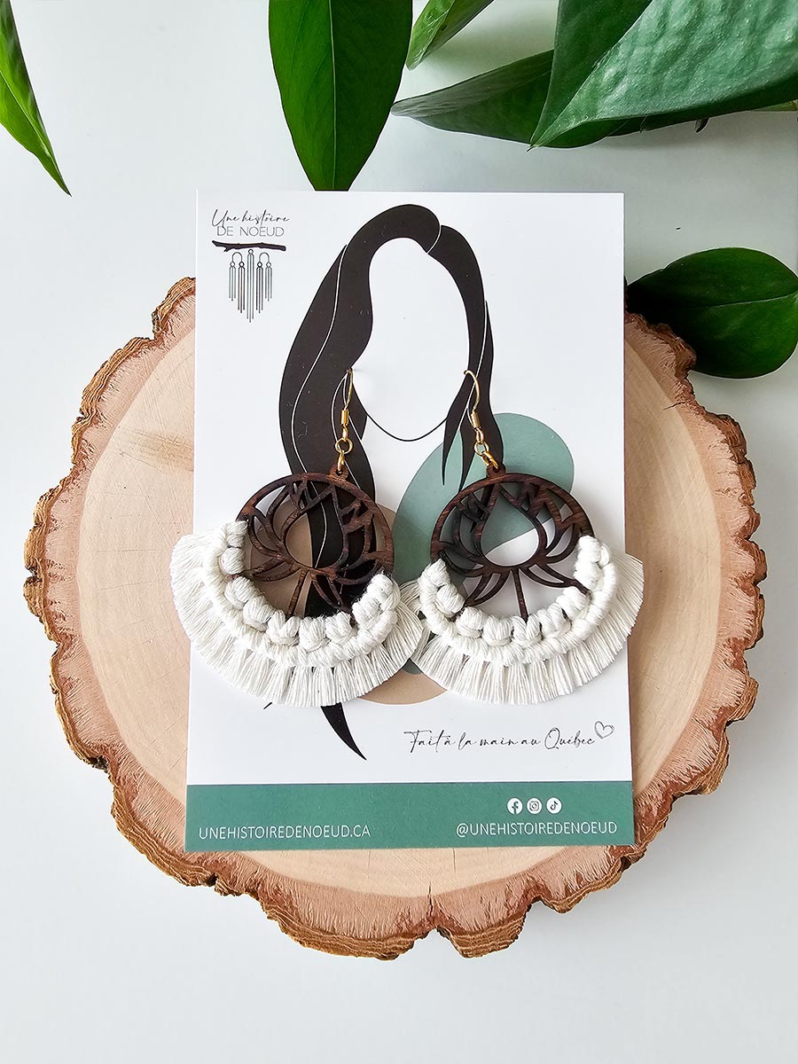 À propos | Boucles d'oreilles en macramé lotus, couleur naturel, crochets or