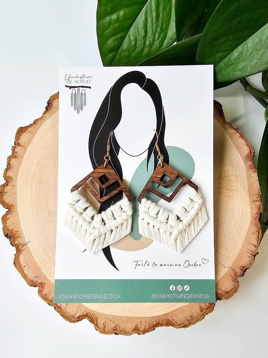À propos | Boucles d'oreilles en macramé sur base en bois grande, couleur naturel et crochet or