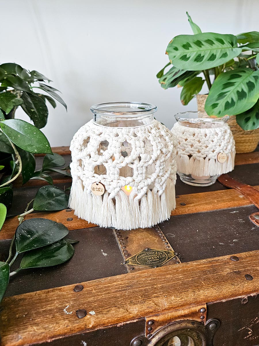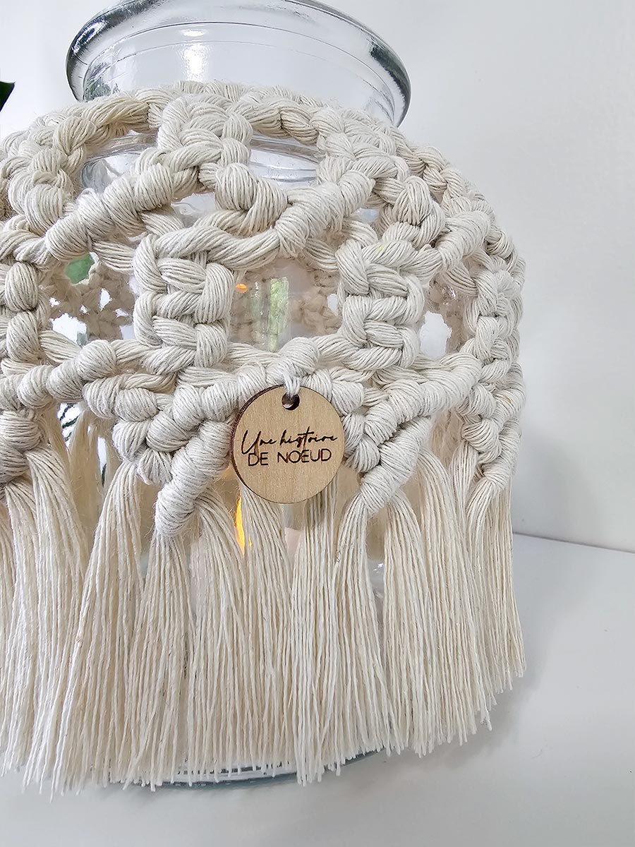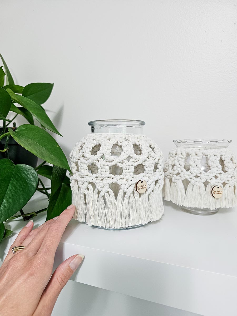 Tu tomberas sous le charme de ce magnifique vase et sa décoration de macramé fait à la main. Avec sa belle couleur naturel, il sera un apportera douceur à ta pièce. ✨