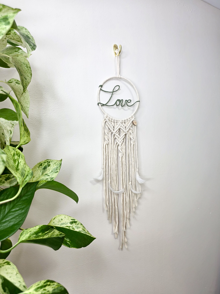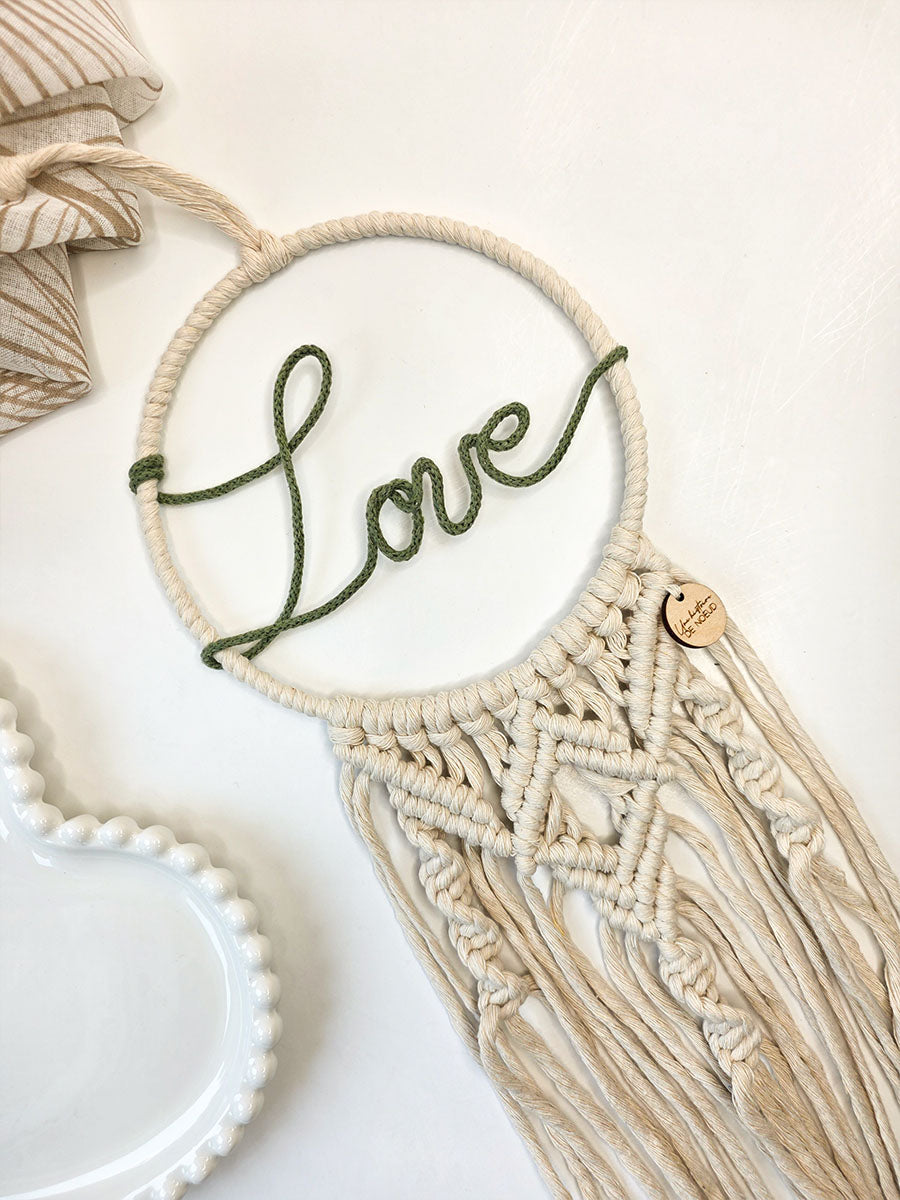 Cette décoration murale en macramé est une ode à l’amour, à la douceur et aux petits détails qui réchauffent un espace. Le mot Love, délicatement formé au centre de l’anneau, devient un symbole tendre et apaisant, entouré de nœuds texturés, de longues cordes naturelles et de plumes légères qui bougent doucement au rythme de l’air. 🤍✨