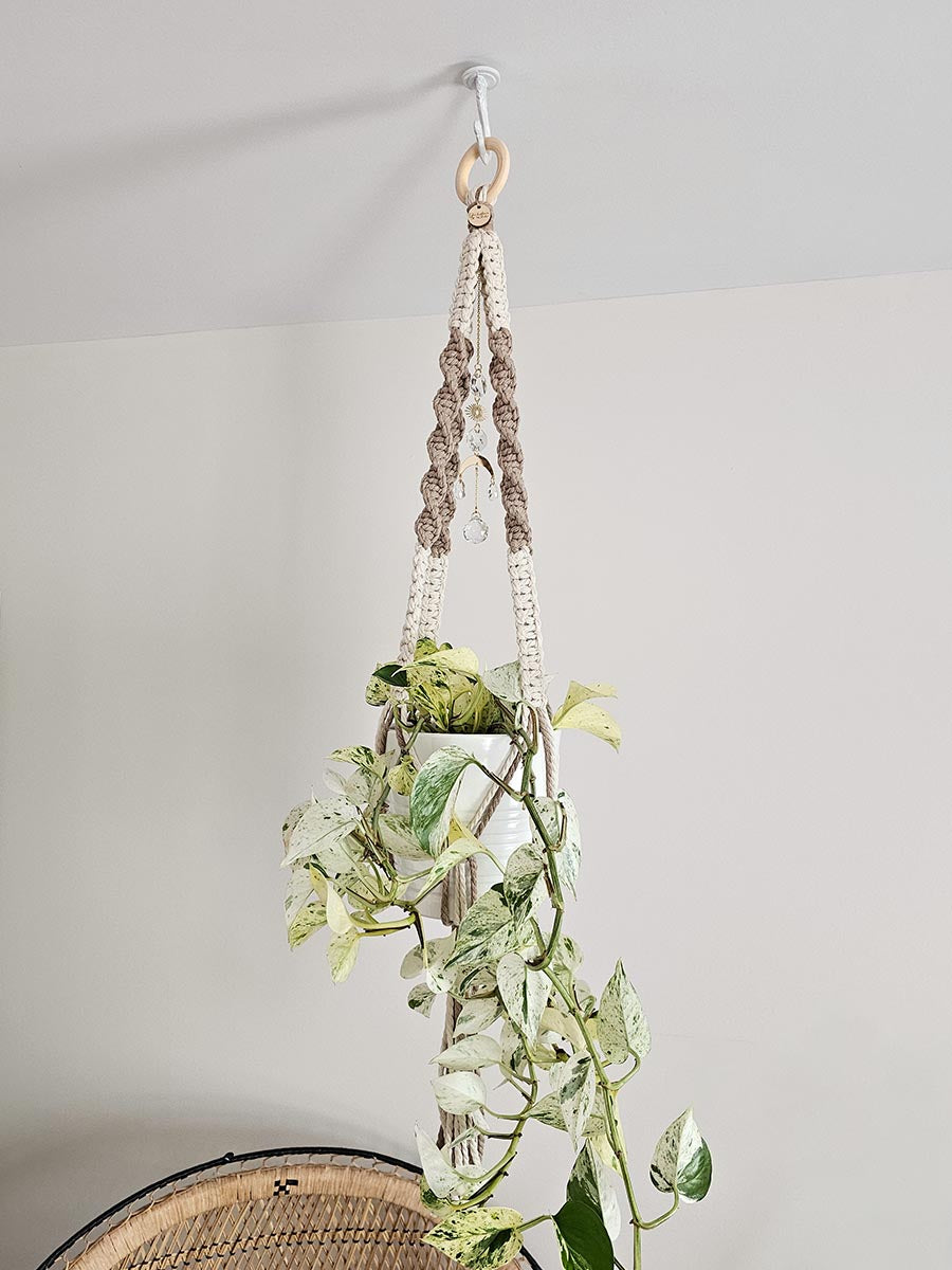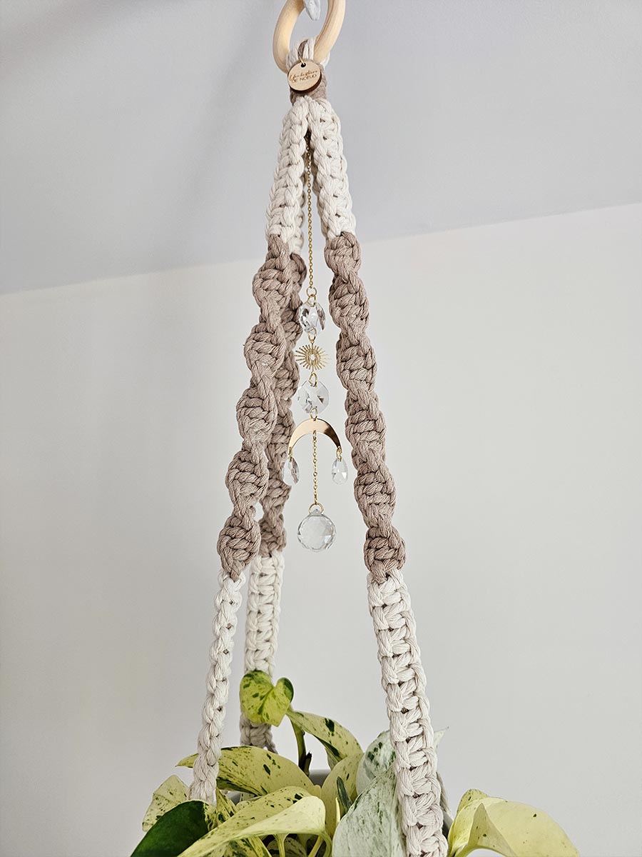 Jardinière longue en macramé sur anneau de bois avec capteur de soleil. ❤️