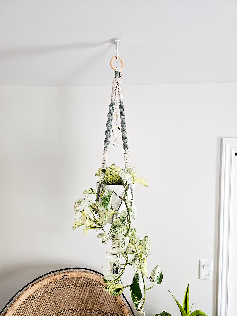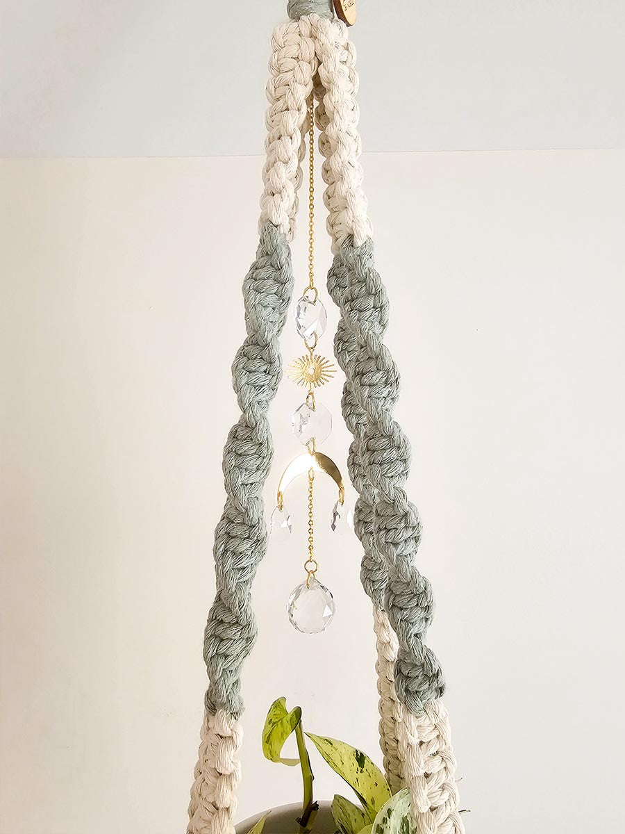 Jardinière longue en macramé sur anneau de bois avec capteur de soleil. ❤️