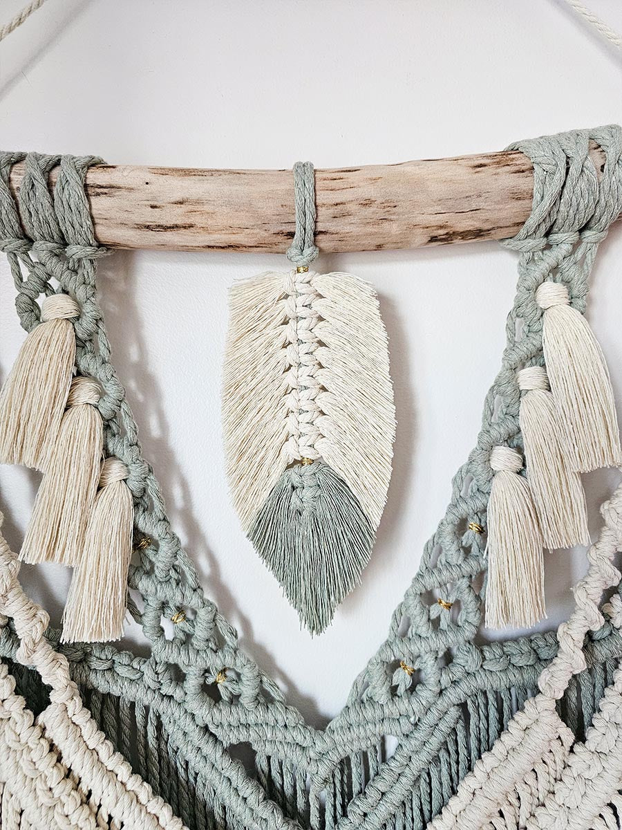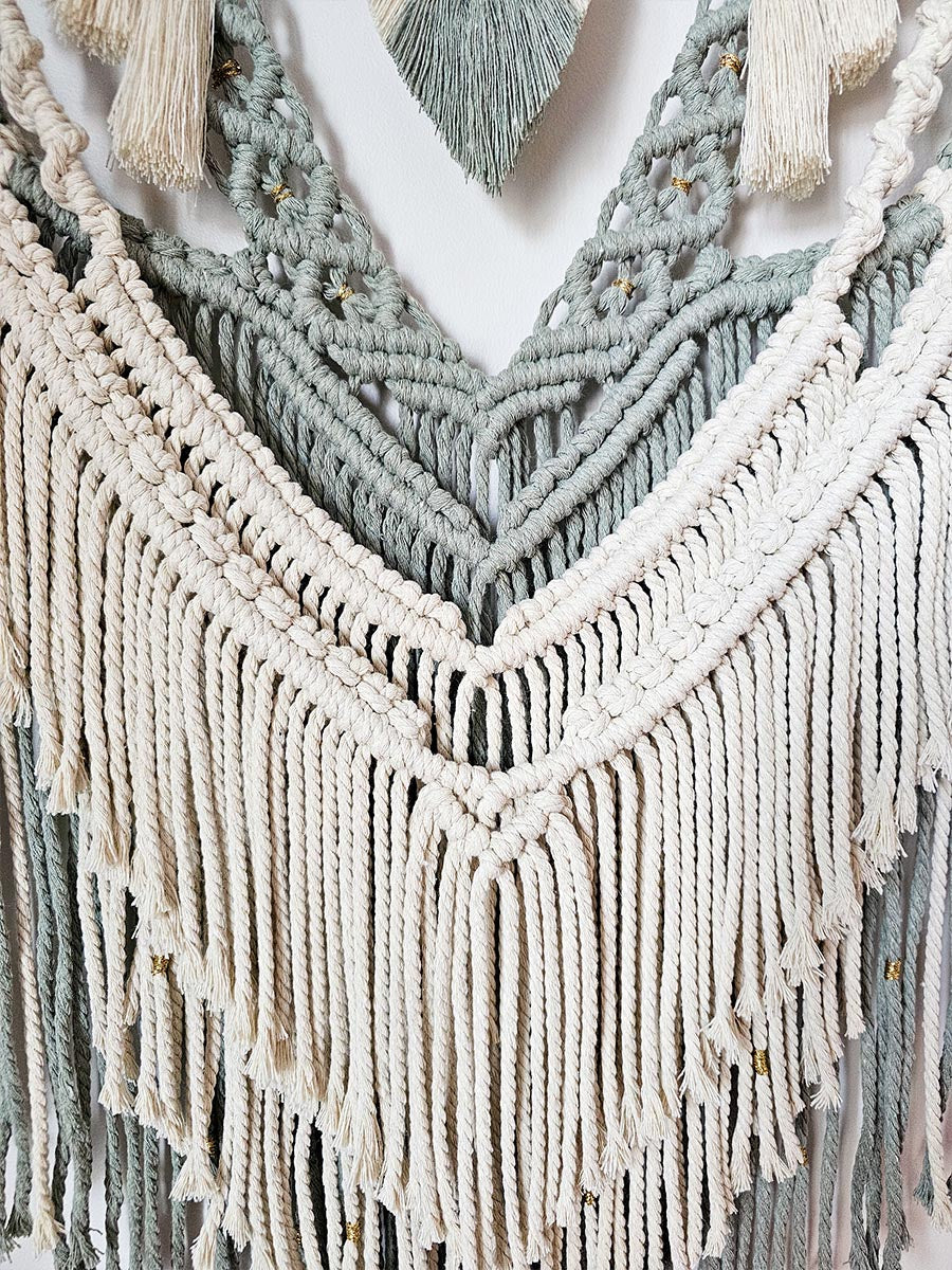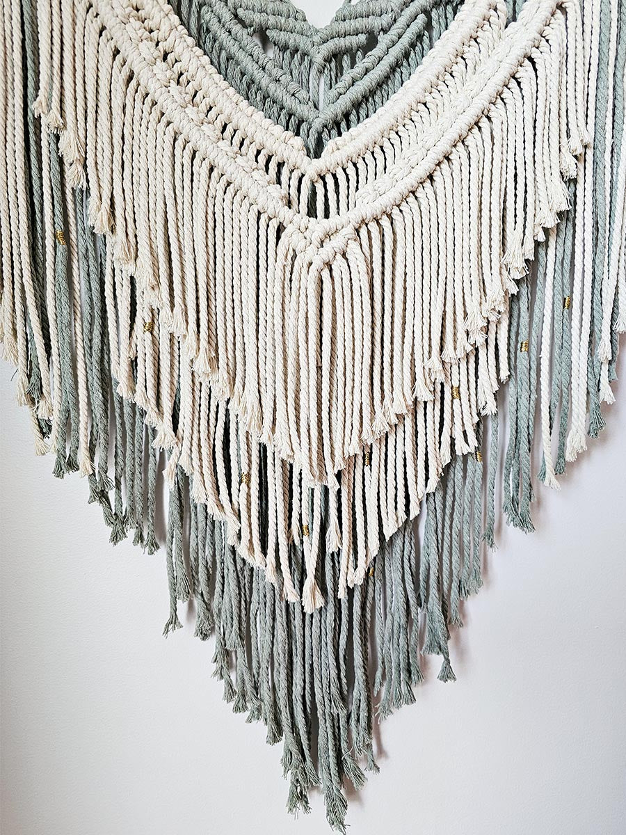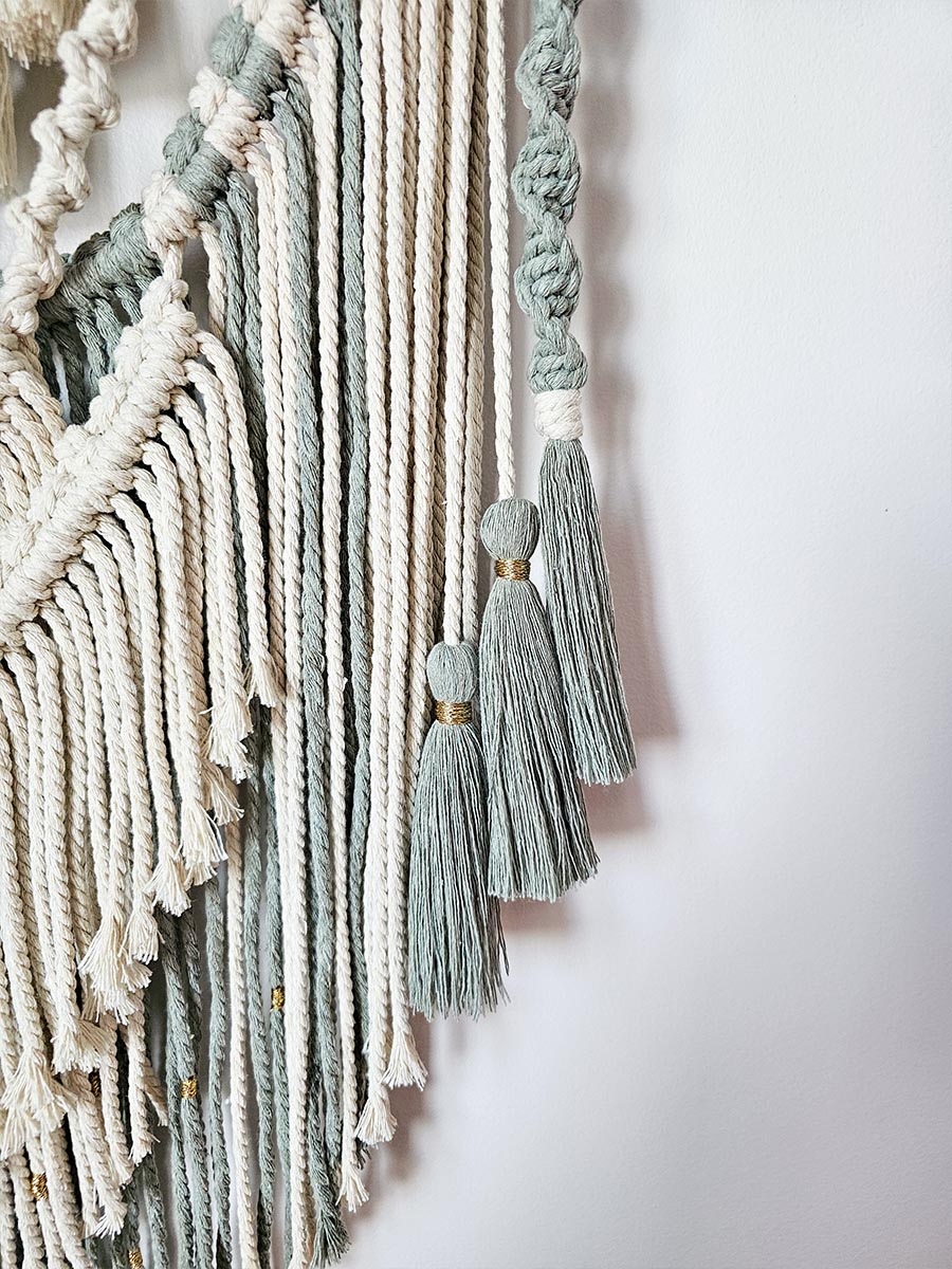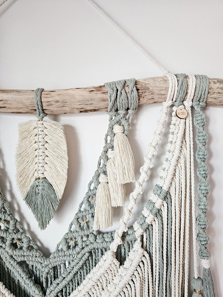 Magnifique macramé mural Amaïa couleur naturel et sauge, avec une touche de doré. ✨️